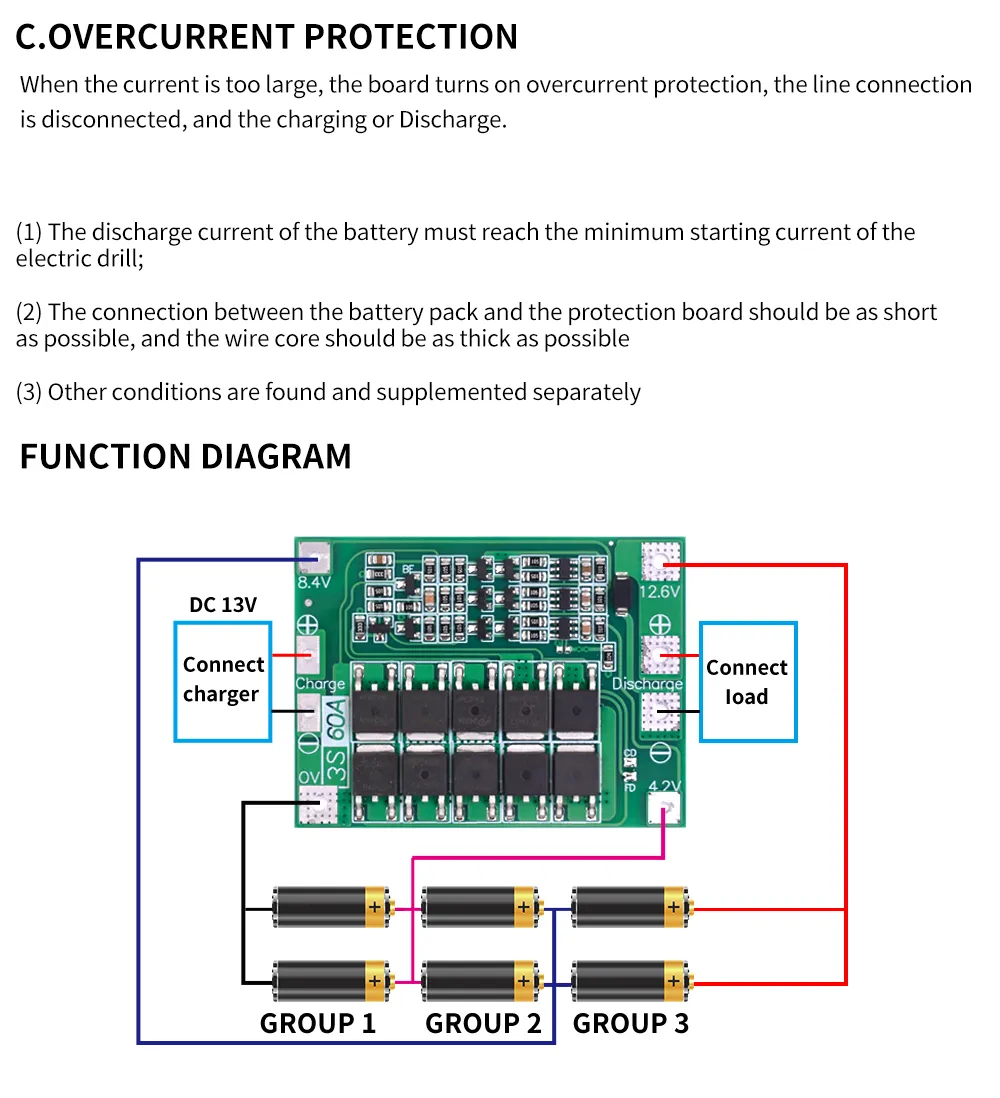 - 4. Continuous discharge current (upper limit): 60A (If the heat dissipation environment is not good, please reduce the load current)